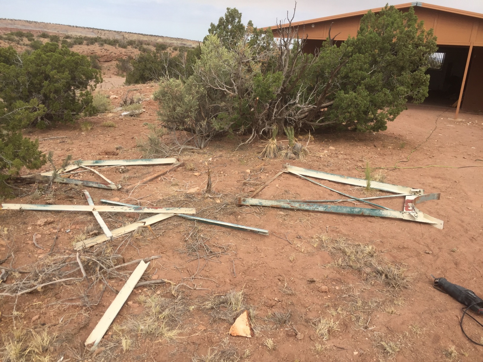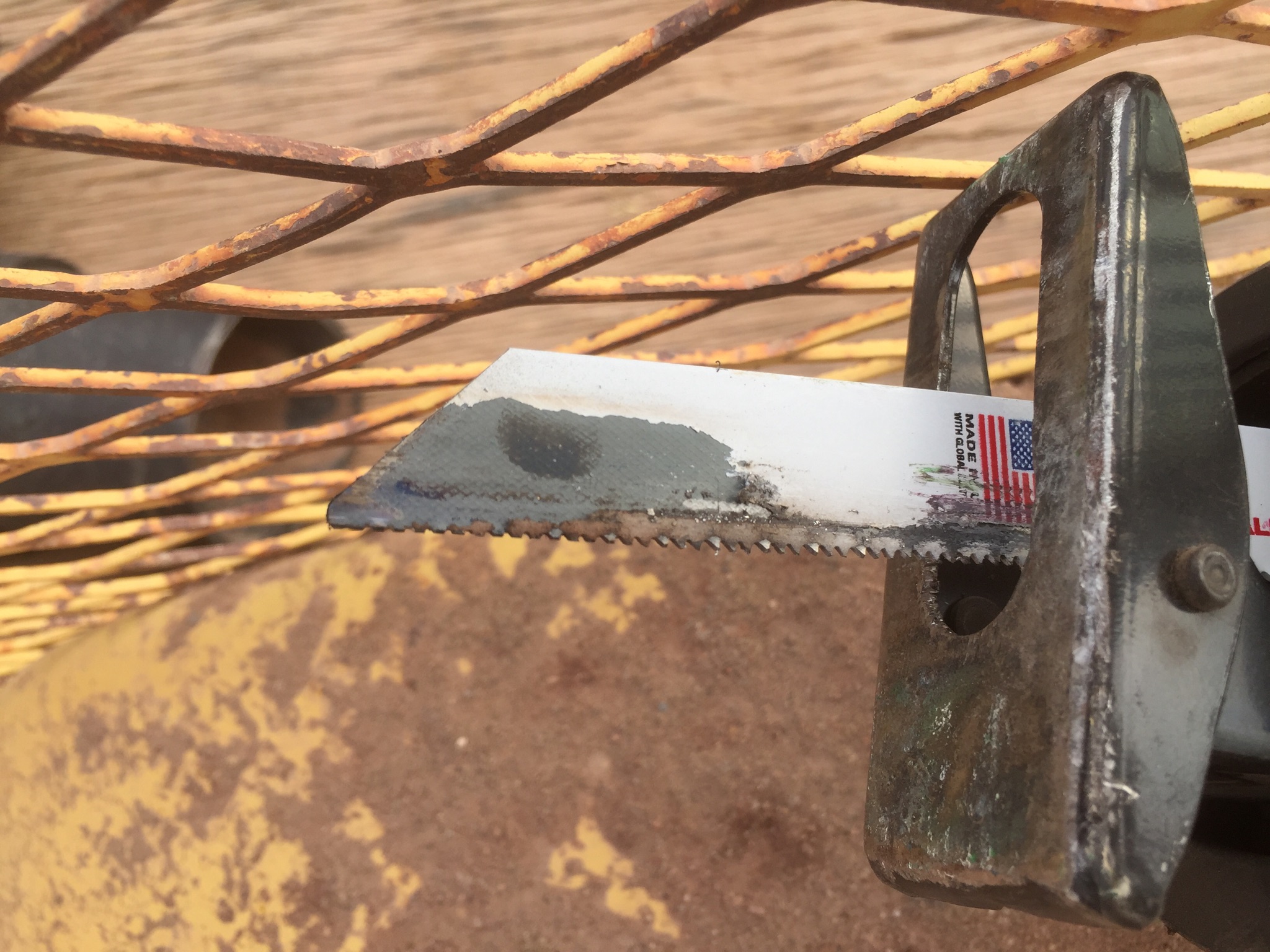 Sigh. Okay – the original and still primary objective is to get the thing into pieces that can be hauled off the plaza, and by all the gods that’s what’s going to happen. I dug that hard hat out of the Jeep’s gear bag and worked up a sweat cutting angle iron. Fortunately Landlady’s plaza has AC electricity, so I didn’t have to futz around with a light-duty cordless saw – I brought an extension cord and went right to the heavy stuff.